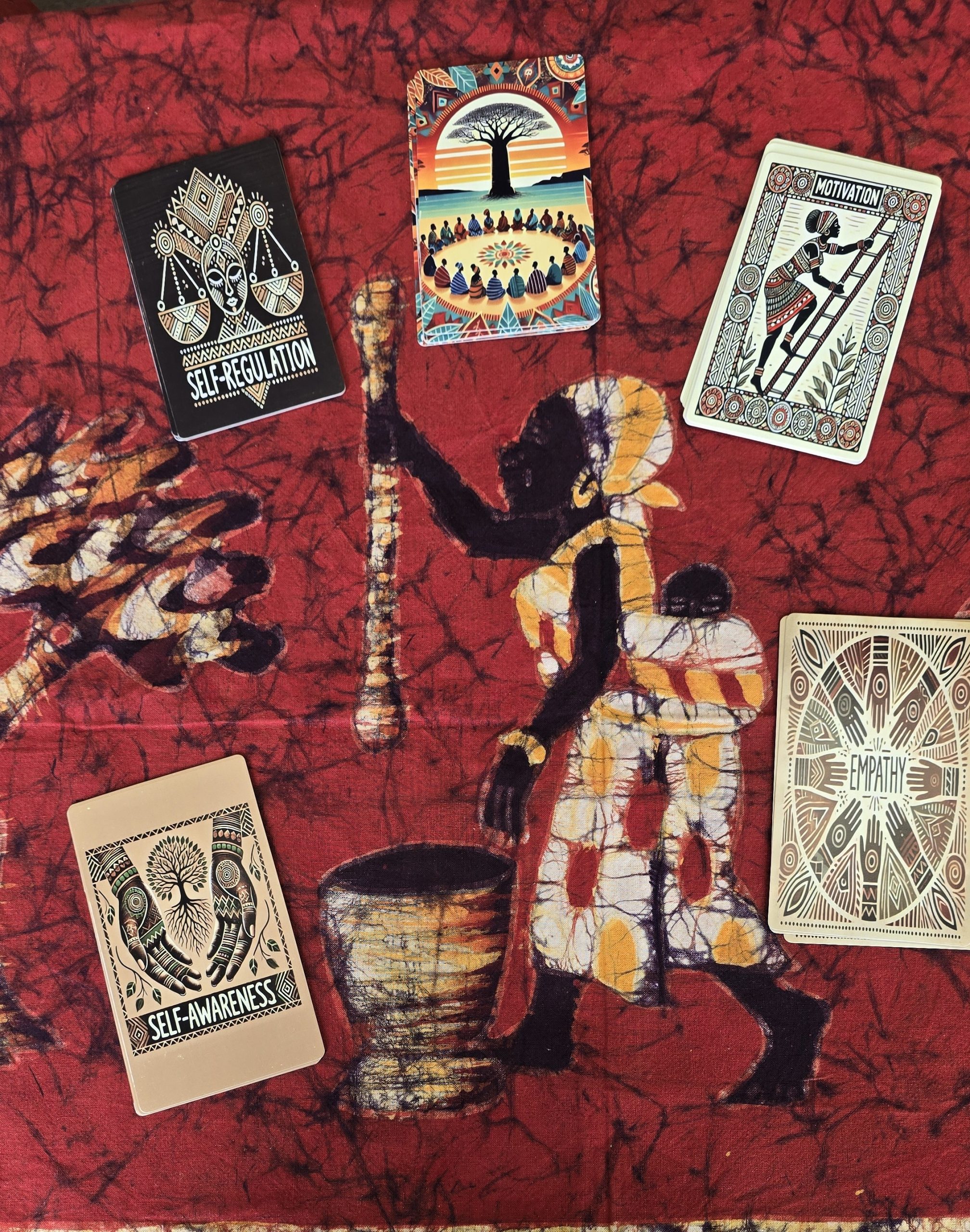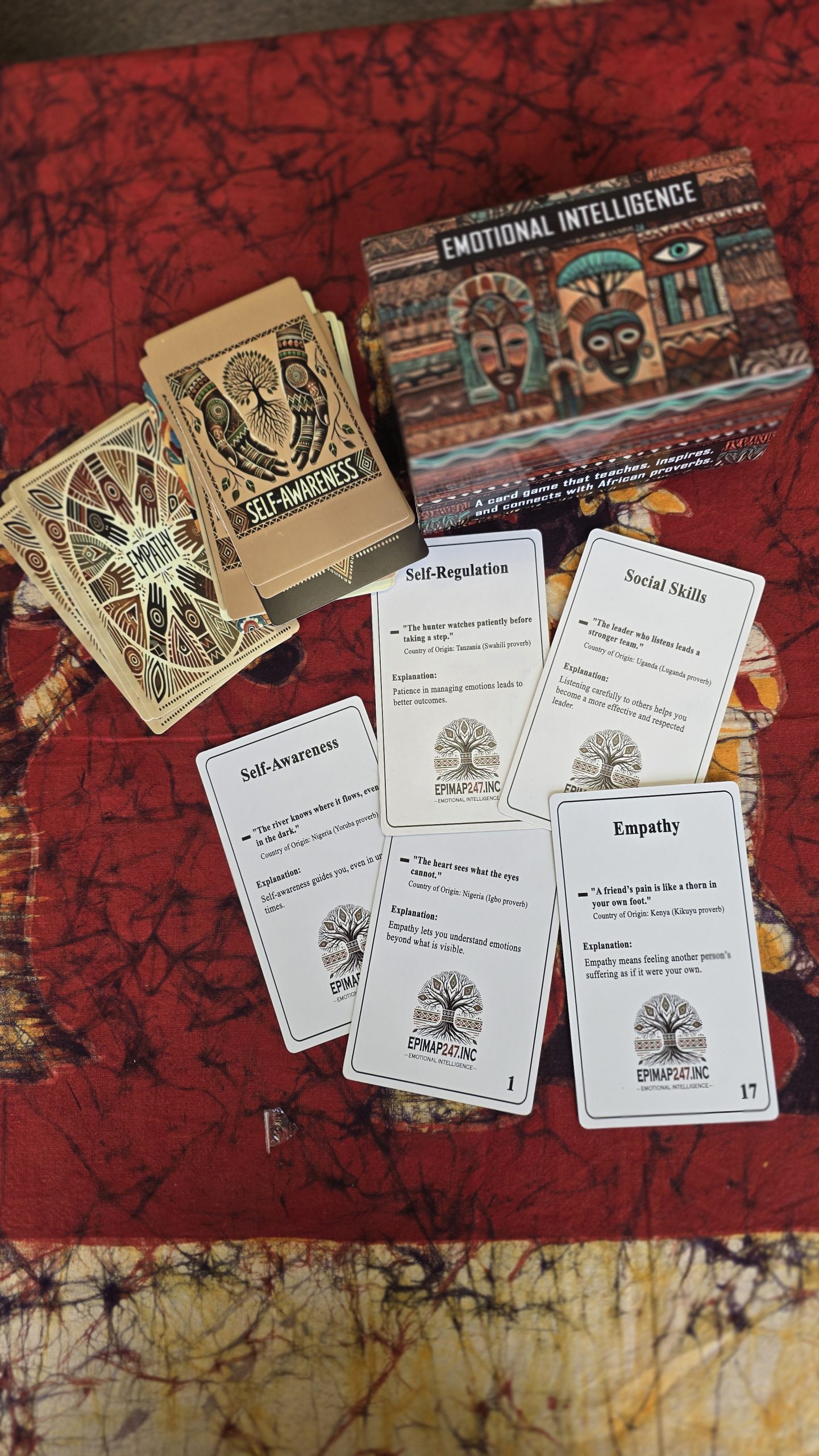 The African-Inspired Emotional Intelligence (AIEI) Card Game is designed to help you explore emotions, build empathy, and strengthen relationships through thoughtful reflection and discussion. Inspired by African proverbs and cultural wisdom, this game promotes self-awareness, emotional control, and social connection in a fun and engaging way.